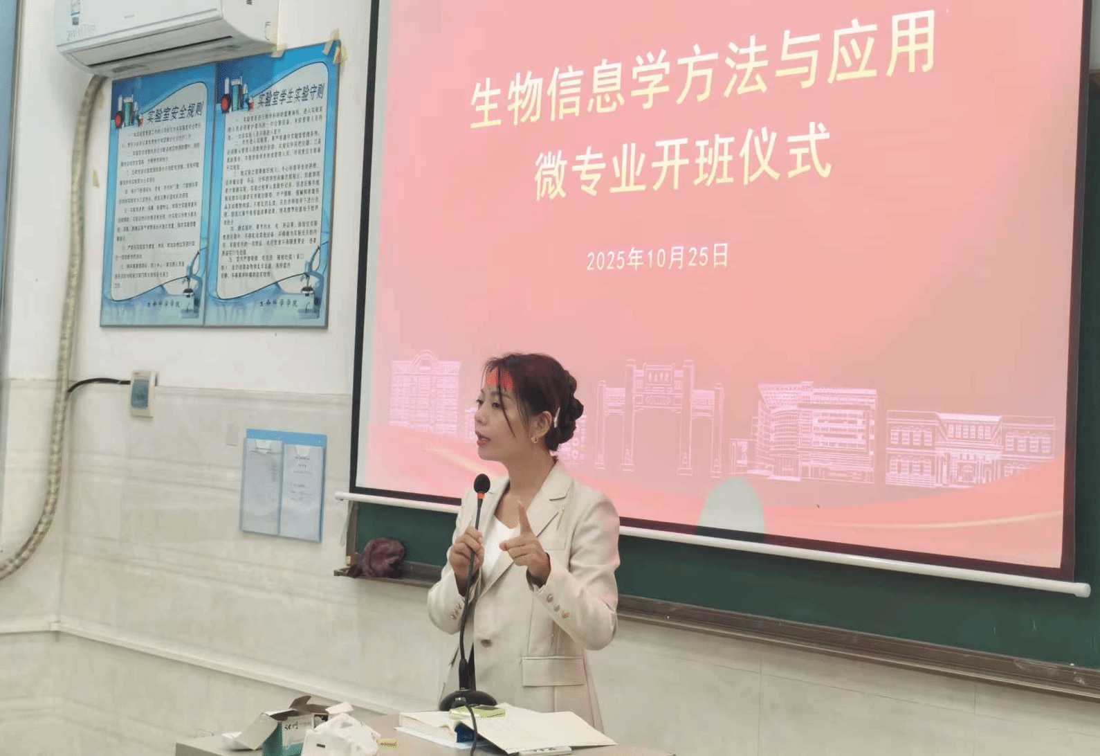 2025年10月25 日,生命科学学院在理工楼116教室举行生物信息学方法与应用微专业开班仪式。学院院长邵玲教授、生物技术系主任兼微专业负责人姜焕焕副教授、教师代表潘莹博士及本微专业全体学员出席活动。仪式由姜焕焕主持。