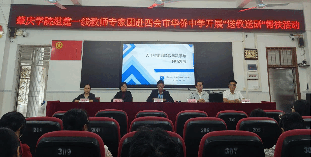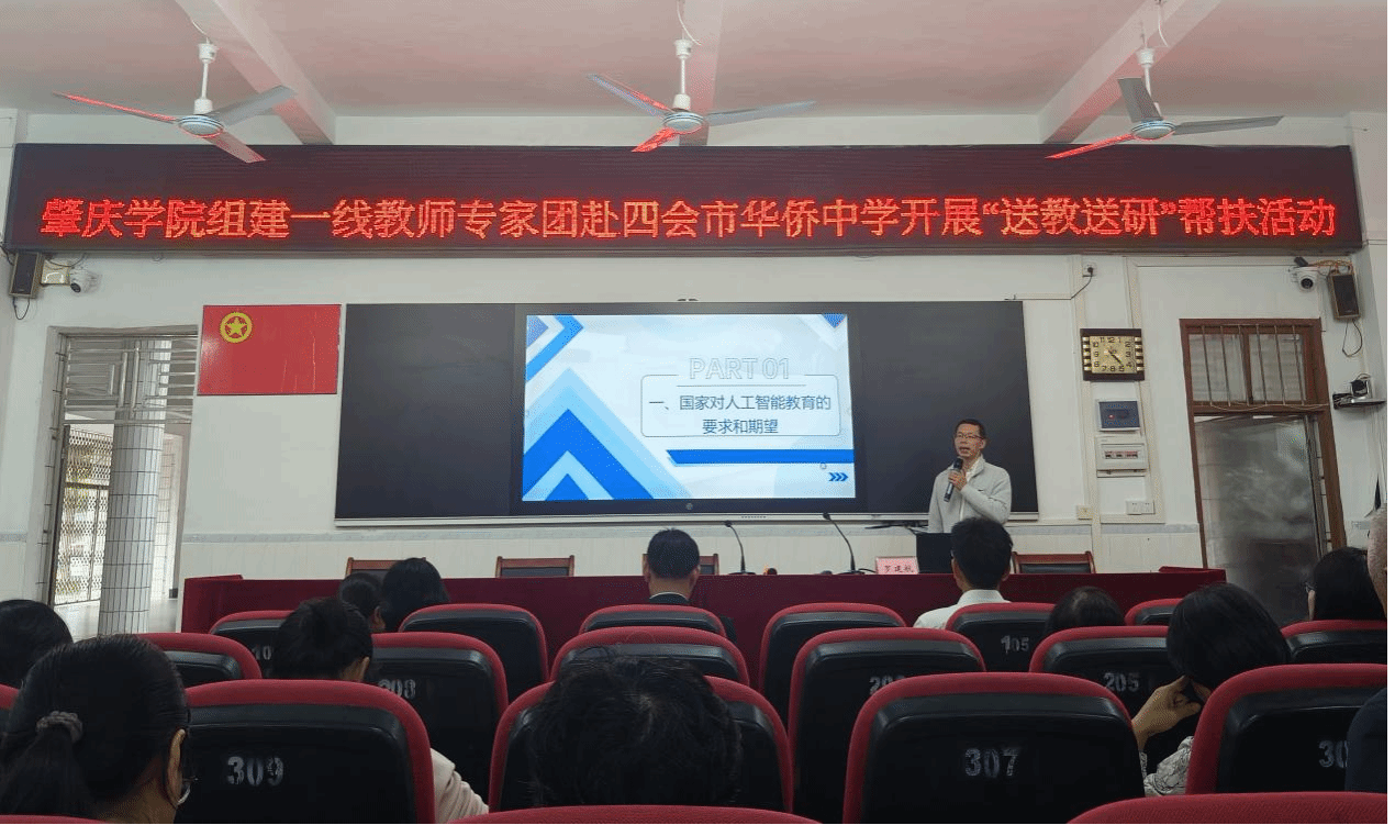 本网讯 为深化校地教育协作,推动人工智能技术与基础教育深度融合,11月13日下午,我院组建送教专家团,由校县纵向帮扶工作专班组组长、生命科学学院院长邵玲带队,专程赴四会市华侨中学开展“送教送研”帮扶活动,举办了一场以“人工智能赋能教育教学与教师发展”为主题的高质量培训讲座。
