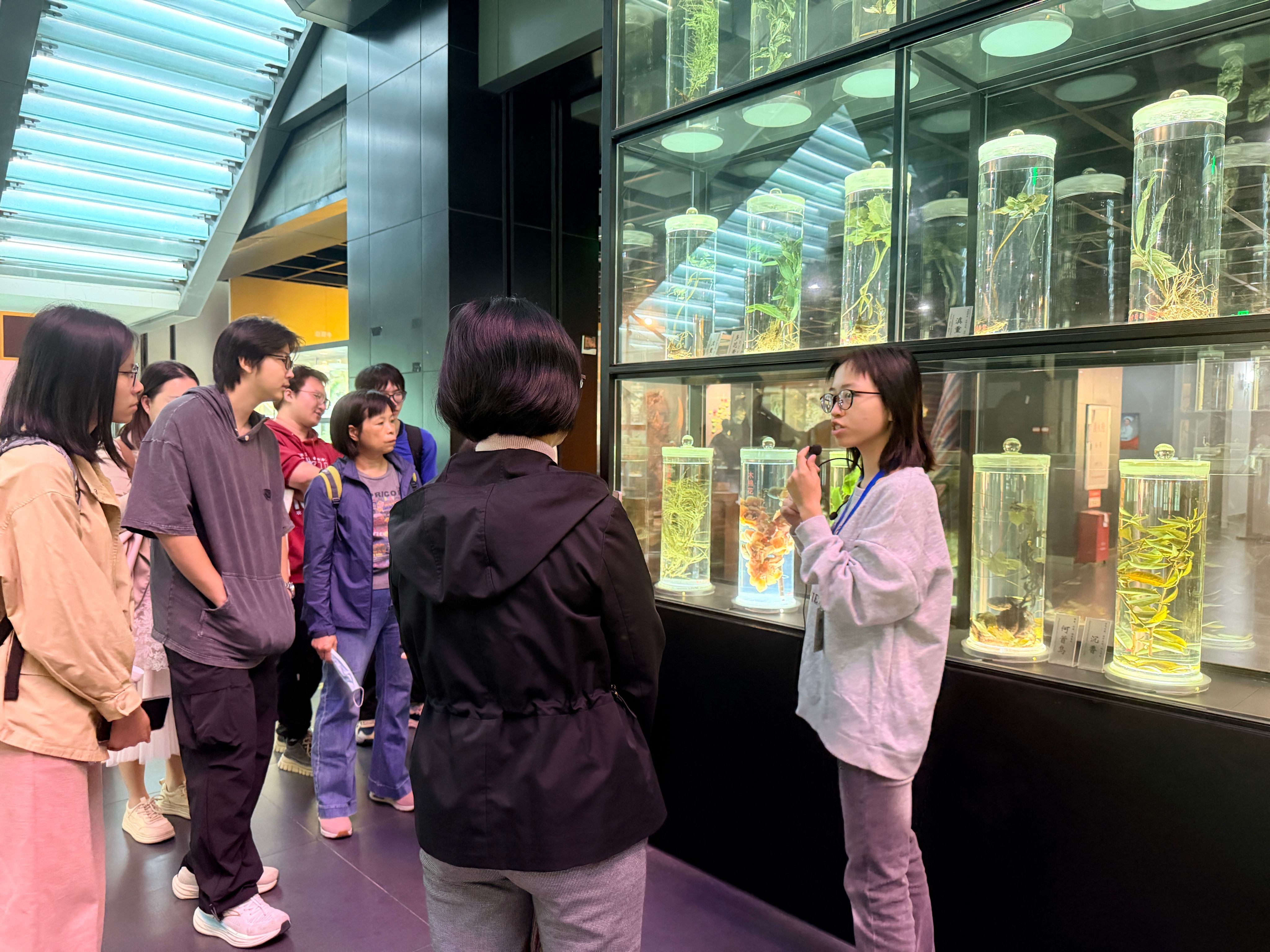 研学首站设在广州中医药大学底蕴深厚的中医药博物馆。馆内珍藏的数千份中药标本令同学们目不暇接。以往仅见于课本插图的广藿香、巴戟天、春砂仁等岭南道地药材,以腊叶标本、浸制标本及精制药材等形式真实呈现。在巴戟天标本前,大家驻足细观——其异常粗大的肉质根,生动诠释了“形如连珠”的典型鉴别特征。“今天亲眼见到如此完整的标本,粗壮的肉质根与茜草科植物的根系特征高度吻合,这样的直观体验让分类学知识变得鲜活起来。”一位同学感慨道。从中药分类到历代医方古籍,博物馆犹如一部立体的中医药百科全书,为同学们进行了一次深刻的中医药文化溯源。