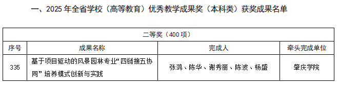 近日,广东省教育厅正式公布了2025年全省学校优秀教学成果奖(高等教育)获奖名单。我院申报的成果“基于项目驱动的风景园林专业‘四链接五协同’培养模式创新与实践”,荣获广东省优秀教学成果奖(高等教育-本科类)二等奖,展现了学院在教学改革与创新方面的新成效。